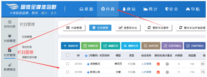 A、點擊【內容】---【欄目管理】,可以進入欄目管理界面