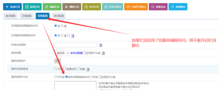 如果設置了【僅限局域網訪問的欄目】------這個欄目是不能開啟靜態化的,一直會是灰色的。這個屬于正常現象。
