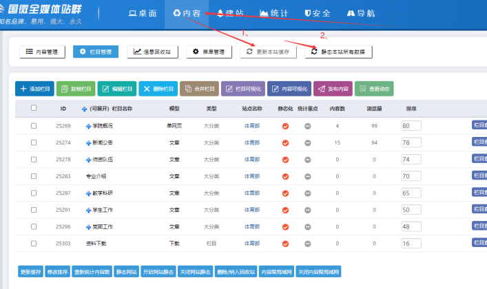 點擊【更新本站緩存】----點擊【靜態本站所有數據】-------然后打開對應欄目預覽,刷新幾次即可看到最新效果