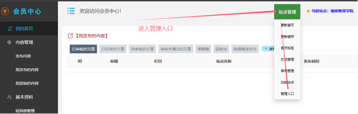 進入會員中心后------點擊【站點管理】------進入【管理入口】,這樣就可以進入后臺了。