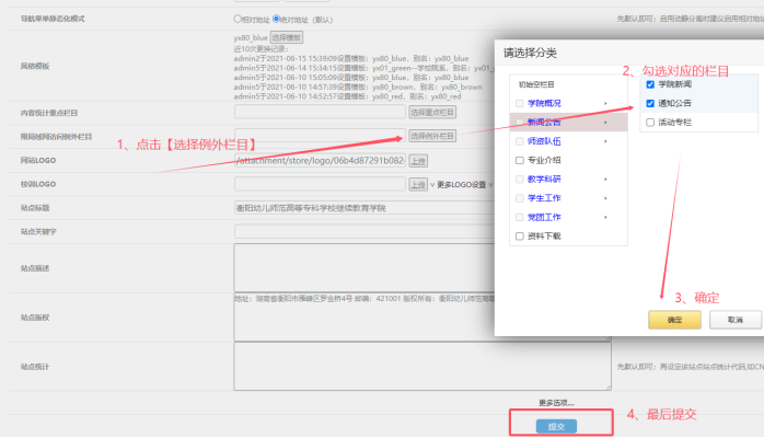 四、找到“限局域網訪問例外欄目”------點擊【選擇例外欄目】------勾選所需的欄目-------點擊【確定】------最后點擊【提交】