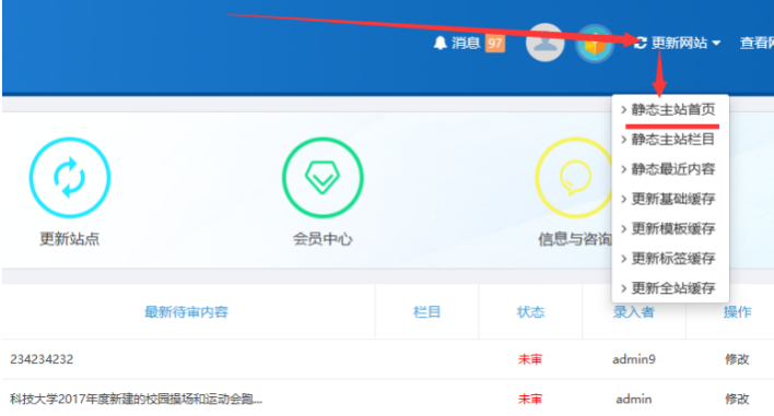 進入【主站后臺】后-------鼠標放在右上角【更新網站】按鈕上-----點擊【靜態主站首頁】-----最后快速連續刷新幾次首頁即可 :