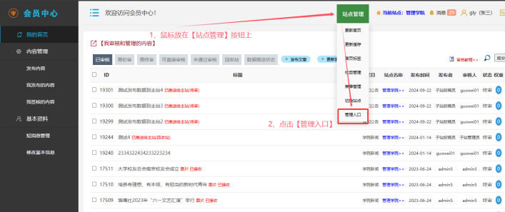 登錄會員中心后------鼠標(biāo)放在【站點管理】按鈕上---點擊【管理入口】------輸入賬號和密碼即可進(jìn)入主站后: