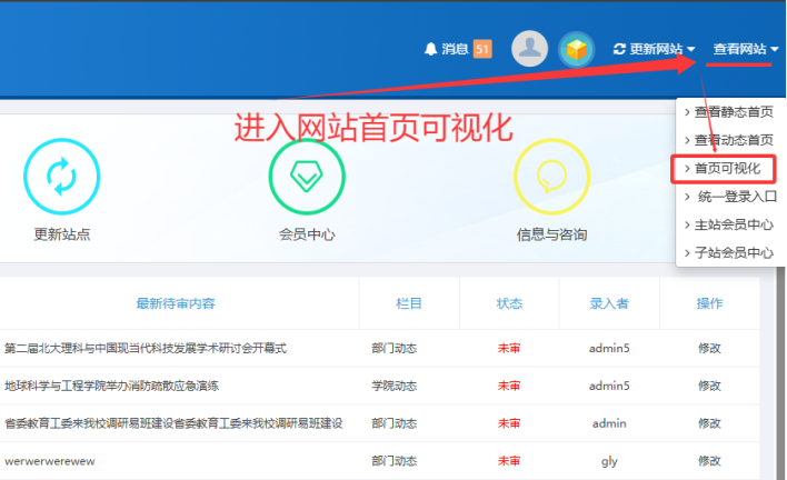 鼠標(biāo)放在【查看網(wǎng)站】按鈕上----------點擊【首頁可視化】:然后看到藍(lán)色標(biāo)簽后,鼠標(biāo)雙擊即可替換首頁橫幅,然后點擊靜態(tài)首頁即可