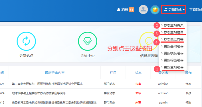 如果網(wǎng)站有異常或更新了看不到效果,萬能方法是----------鼠標(biāo)放在【更新網(wǎng)站】按鈕上------然后按數(shù)字標(biāo)記順序分別點擊【更新全站緩存】、【靜態(tài)主站首頁】、【靜態(tài)主站欄目】、【靜態(tài)最近內(nèi)容】: