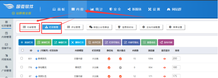 點擊【內(nèi)容】----------點擊【內(nèi)容管理】、【欄目管理】 :