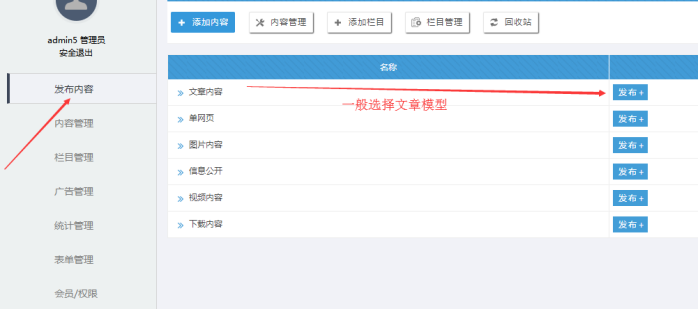 系統有多個模型,每個模型不同字段,用來存放不同要求的內容;有文章模型、圖片模型、視頻模型、下載模型、信息公開模型;絕大部分我們用文章模型。