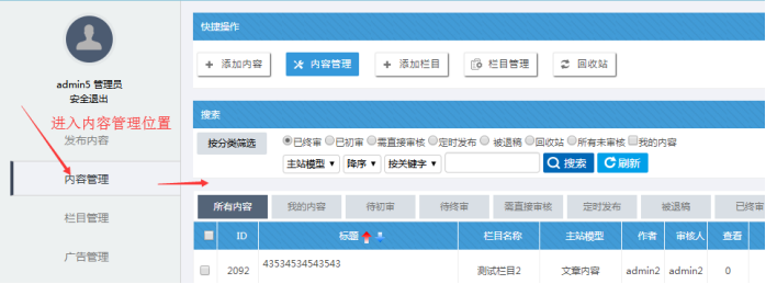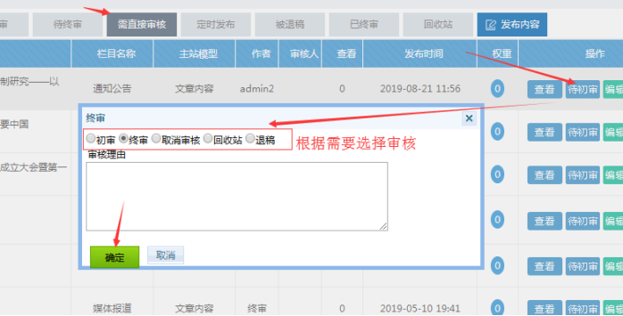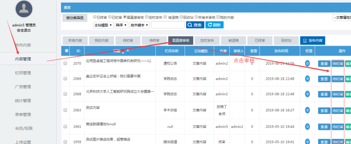 C:內容的審核(點擊需直接審核的,可以查看到所有待審核的內容,無論是初審還是終審)