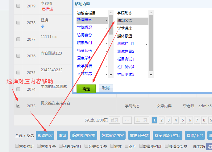 F:內容的移動(勾選所需內容,移動到其他欄目)