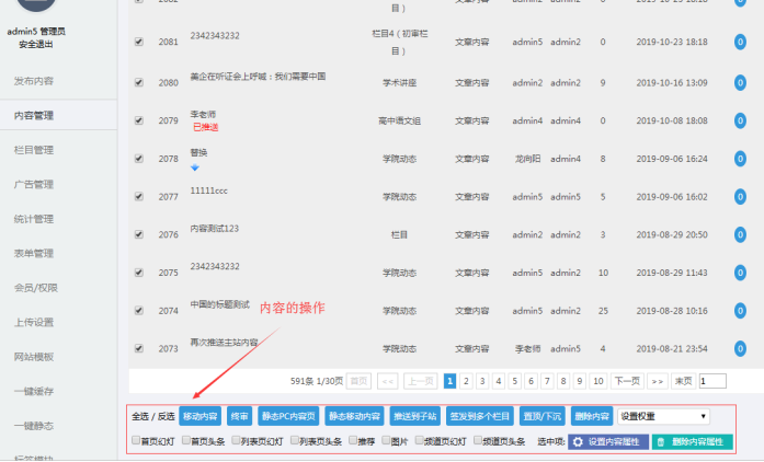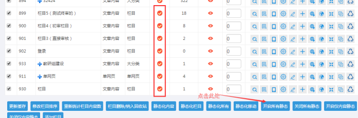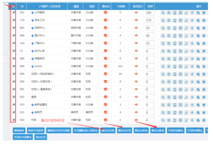 J:欄目和內容靜態(勾選欄目,分別點擊靜態欄目和靜態內容;前臺是靜態化屬于開啟狀態;如果有內容顯示不匹配,就考慮靜態化)