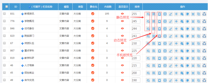 B:欄目預覽(第一個按鈕是靜態頁、第二個是動態,第三個是手機)