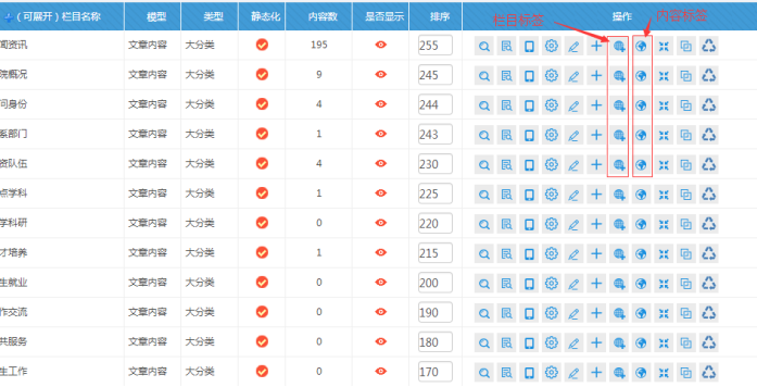 E:欄目標簽和內容標簽(如果需要顯示此欄目和此欄目下內頁的標簽,分別點擊此處)