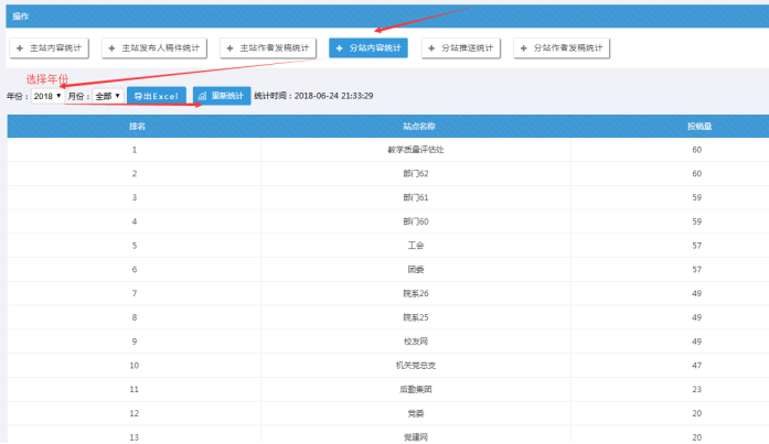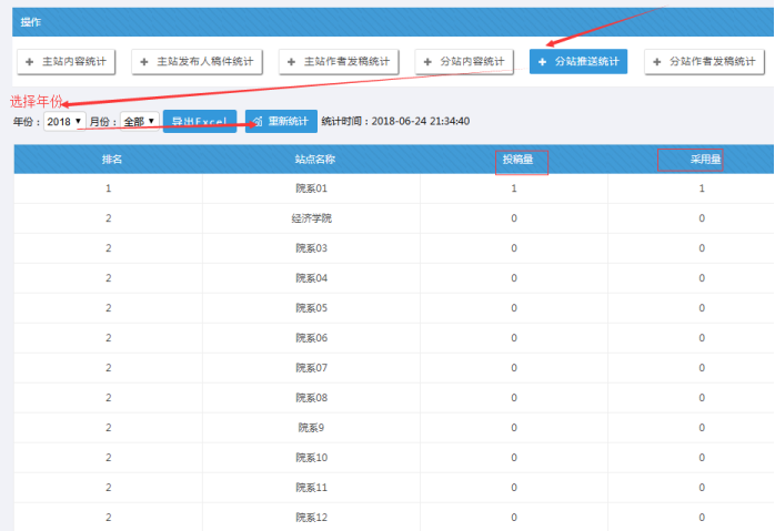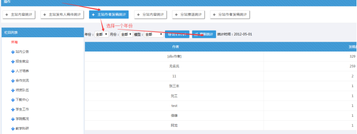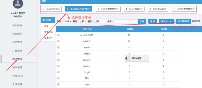 統計管理(頂部有各種統計,其中發布人和作者可以分開統計;統計的時候需要選擇年份,然后點擊重新統計按鈕,可以導出excel)