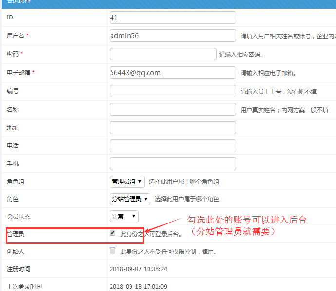 C:勾選此處可以讓管理員進入后臺(分站管理員賬號需要勾選)