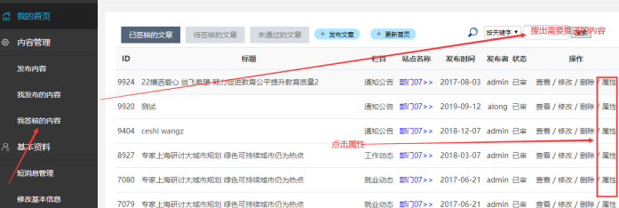 進(jìn)入后------點(diǎn)擊我簽核的內(nèi)容----點(diǎn)擊屬性(先搜索出所需推送的內(nèi)容)-----點(diǎn)擊后會提示登陸后臺,則登錄后臺