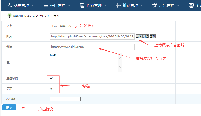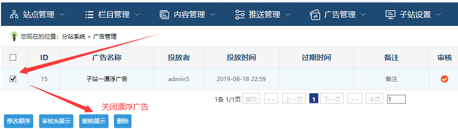 如果要關閉現在正在運行的漂浮廣告-----點擊“撤銷展示”------更新標簽緩存----靜態首頁即可