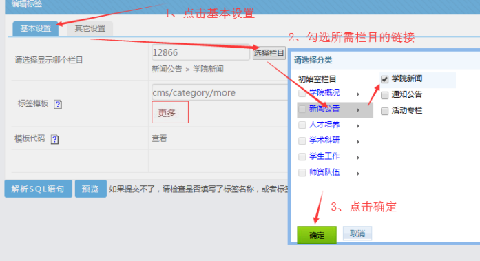點擊“基本設置”-----點擊“選擇欄目”---“勾選所需鏈接的欄目”--點擊“確定”: