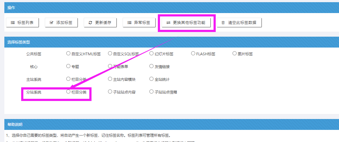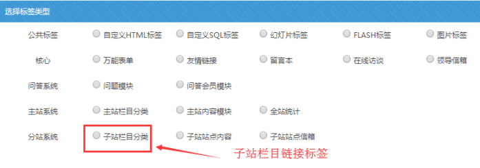 特別說明: 此標簽類型,在標簽列表中,屬于“子站欄目分類”標簽,如果是一個新標簽,之前沒