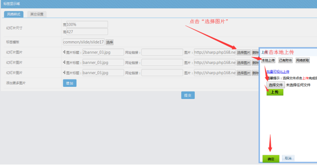 B:圖片上傳:點擊“選擇圖片”-----點擊“本地上傳”---“選擇文件”--點擊“上傳”----點擊確定: