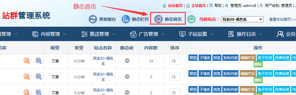 每個(gè)站點(diǎn)的管理員,都可以對(duì)自己的站點(diǎn)的欄目和內(nèi)容,進(jìn)行靜態(tài)操作(前提是可進(jìn)行靜態(tài))。