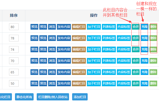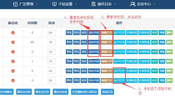 A:底部的靜態化按鈕、欄目批量刪除按鈕、添加欄目按鈕、重置內容統計按鈕。
