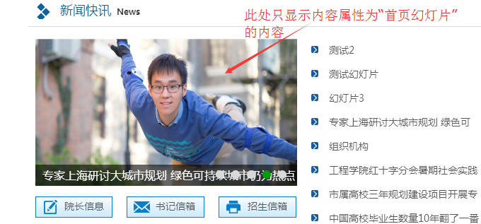 上面的屬性中,勾選了“首頁幻燈”屬性的,可以在這個位置顯示。