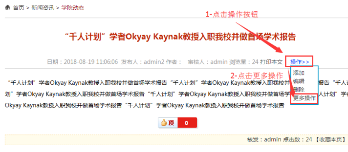 先登錄后-----打開某篇內(nèi)容-------點(diǎn)擊“操作”按鈕------點(diǎn)擊”更多操作”------進(jìn)入設(shè)置狀態(tài)界面;