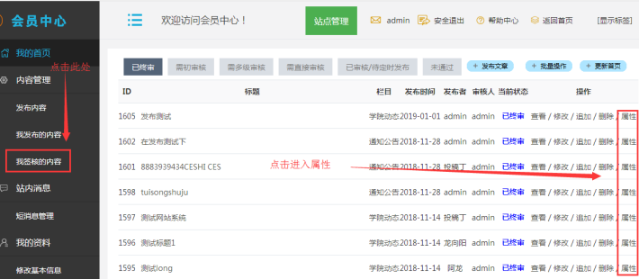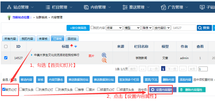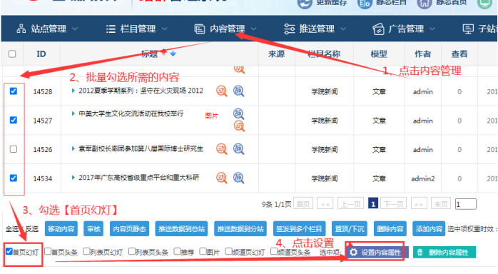 登陸子站后臺--------點(diǎn)擊“內(nèi)容管理”----------------可以批量勾選多個內(nèi)容---------然后進(jìn)行相關(guān)設(shè)置