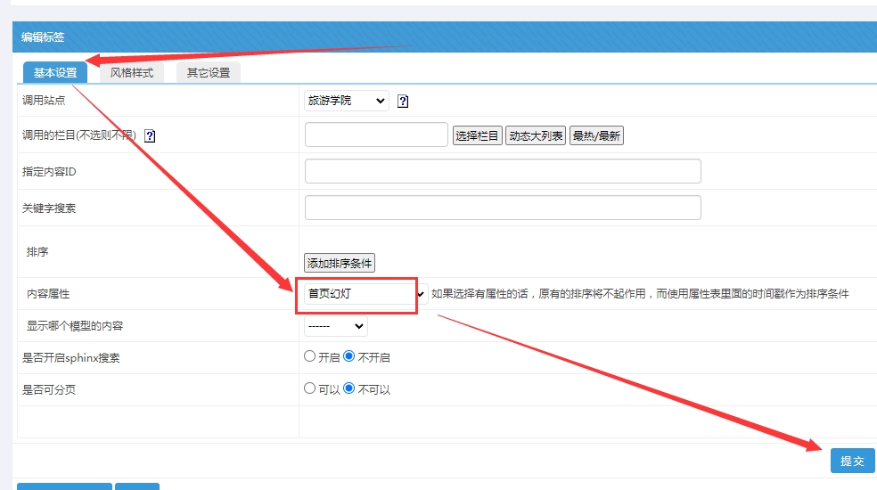 需要對應(yīng)首頁位置的標(biāo)簽,事先需要設(shè)置為帶有【首頁幻燈片】的屬性內(nèi)容才能顯示,這個地方只需要設(shè)置一次即可。