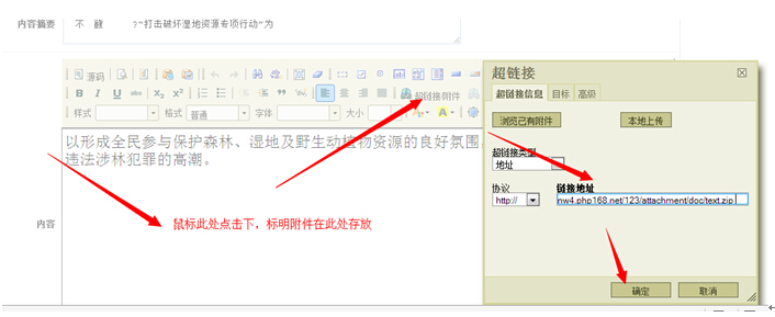 編輯文章內頁,鼠標先在編輯框需要的地方點擊下,然后點擊編輯框上面的“超鏈接/附件”按鈕。彈出框中輸入上面的附件地址即可。然后點擊確定。
