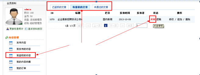 點擊我簽核的內容,可以看到待簽核的文章按鈕,切換后,你可以審核你要審核的內容,點擊未審按鈕即可;當然,你可以選擇退稿。退稿后,用戶可以重新修改再提交投稿。
