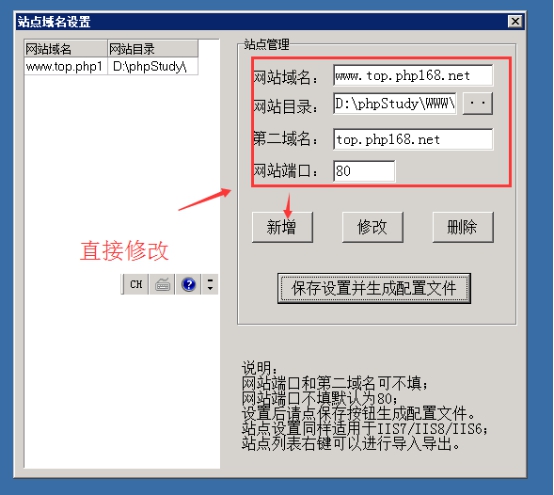 如果你想新增網站和域名,但是出現下面界面,就是之前的域名設置的界面圖。那么你直接在上面修改所需要的域名和目錄,然后點擊新增即可。